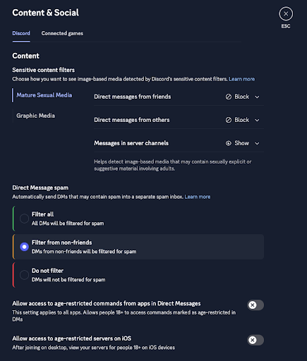 We know it’s important for users to understand what controls they have over their experience on Discord and how to be safer. This article covers settings that can help reduce the amount of unwanted content you see on Discord and that promote a safer environment for everyone.